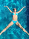A vibrant aqua, classic string bikini top made from body sculpting, Italian lycra. This top has removable pads and can be tied in a halter or worn in an over the shoulder style. The model is a 32B and wears a size Small.
