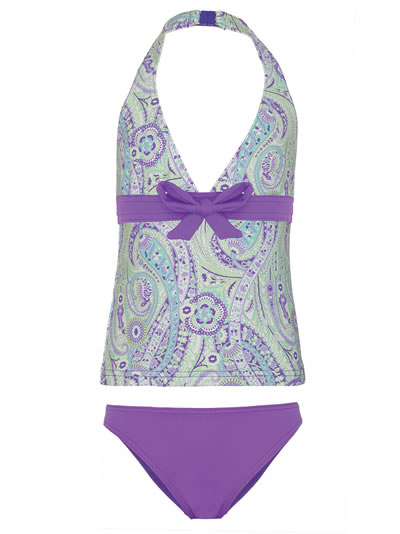 The Paisley Tankini is a great addition to a girl’s holiday wardrobe, featuring a halter neck strap, a contrasting purple bow and an eye-catching paisley pattern. The matching purple bottoms go well with both the Paisley Tankini top, and the Paisley Bikini top. There is an adult bikini in the same print.